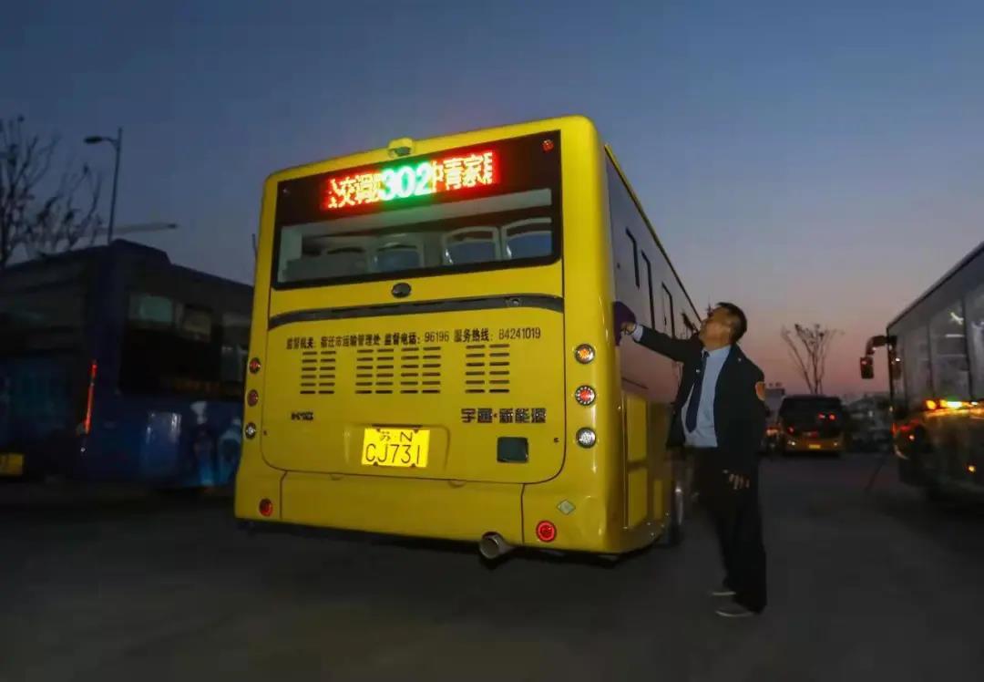 5點(diǎn)半,302路公交車的車牌燈準(zhǔn)時(shí)亮起,一個(gè)身影進(jìn)出車廂,熟練地逐項(xiàng)檢查電池電量、四輪胎壓、雨刮器等,測(cè)試剎車、離合、制動(dòng)器,確保車輛性能一切正常后拿起抹布和拖把,麻利地將車輛內(nèi)外打掃干凈。