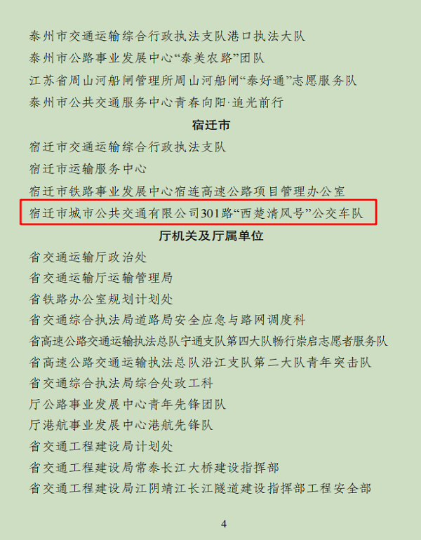 近日,省交通運(yùn)輸行業(yè)黨委發(fā)布《關(guān)于表揚(yáng)全省交通運(yùn)輸行業(yè)青年建功標(biāo)兵團(tuán)隊(duì)和青年建功標(biāo)兵個(gè)人的通報(bào)》,公交公司301路“西楚清風(fēng)號(hào)”公交車隊(duì)榮獲“全省交通運(yùn)輸行業(yè)青年建功標(biāo)兵團(tuán)隊(duì)”稱號(hào)。