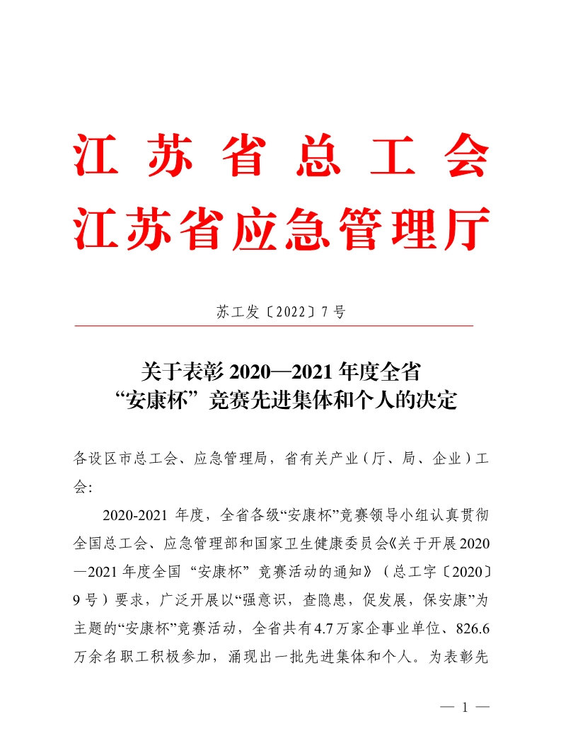 日前,省總工會和省應急管理廳發(fā)文通報了2020-2021年度江蘇省“安康杯”競賽評選情況,宿遷交建榮獲省“安康杯”競賽“優(yōu)勝單位”的榮譽稱號。