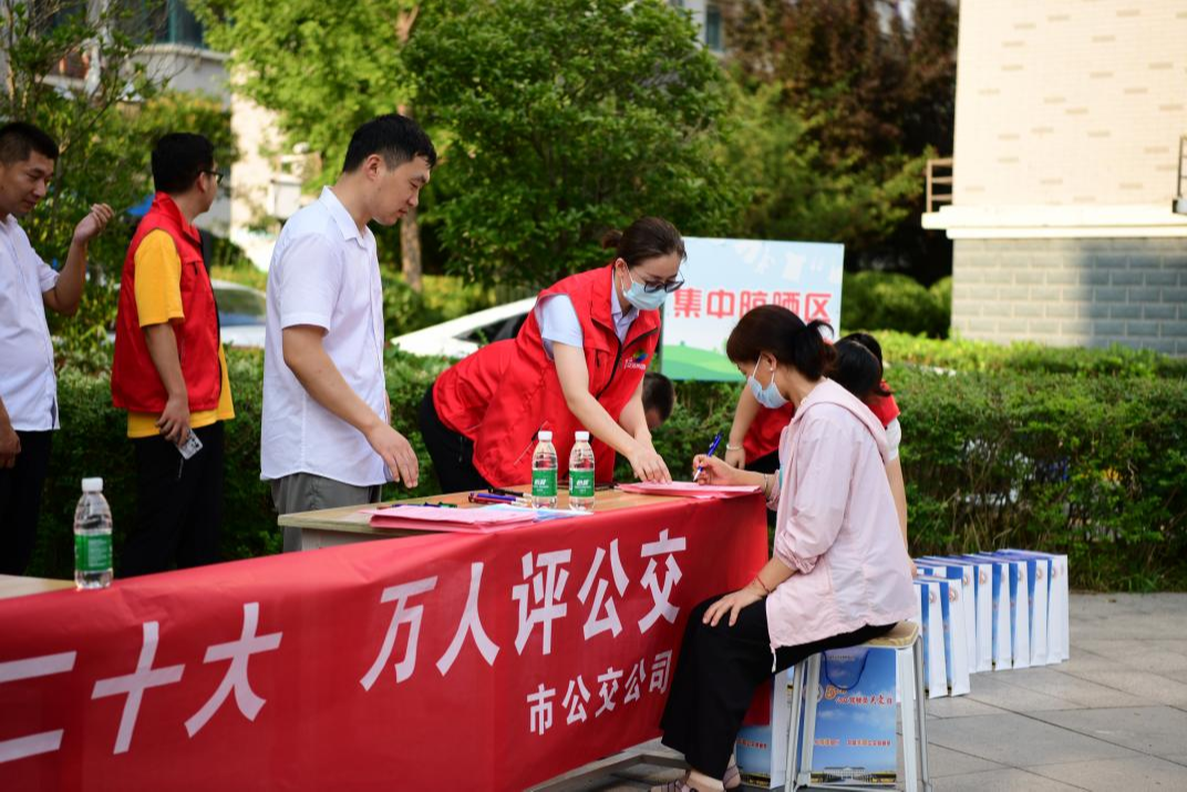 在白堡社區(qū),工作人員熱情邀請群眾為公交服務(wù)滿意度“打分”,并征求群眾對公交服務(wù)的意見和建議,受到群眾的好評。