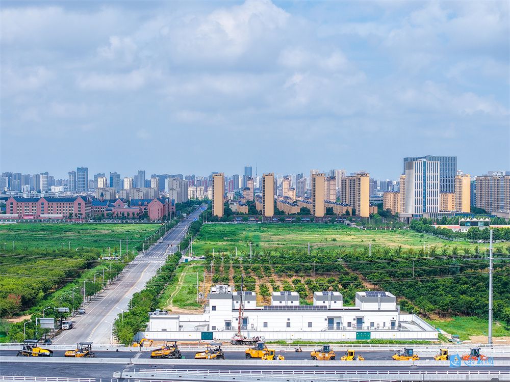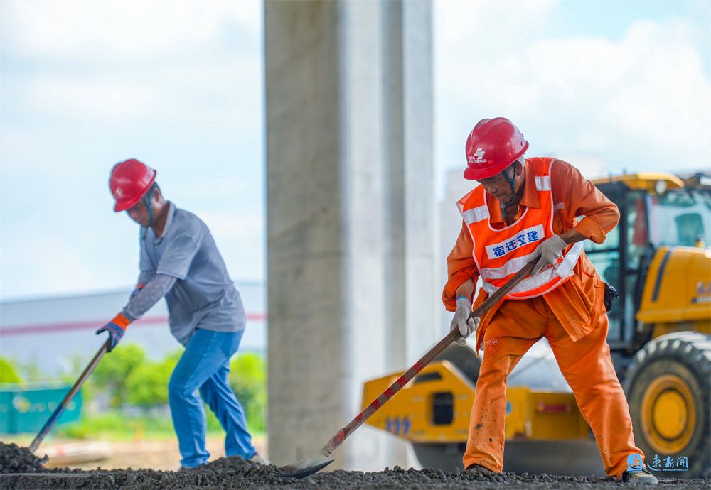 7月22日,在宿遷市宿豫區(qū)酒都路快速化改造工程現(xiàn)場(chǎng),建設(shè)者們?cè)诟邷叵录泳o施工,全力推進(jìn)項(xiàng)目建設(shè)。