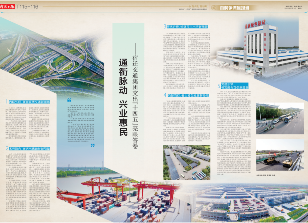 12月8日,《宿遷日報》通版刊登《通衢脈動 興業(yè)惠民——宿遷交通集團交出“十四五”亮眼答卷》,全方位展現(xiàn)了集團“十四五”時期在項目建設(shè)、市場開拓、公共出行、改革發(fā)展、黨的建設(shè)等領(lǐng)域的亮眼成就?,F(xiàn)予轉(zhuǎn)載。